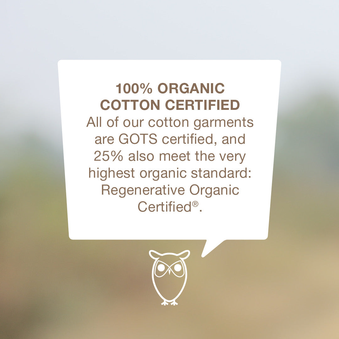 Knowledge is among the first, and very few, clothing companies licensed to work with Regenerative Organic Certified® cotton. The purpose of regenerative organic farming is to reverse CO2 buildup by restoring soil health. Avoiding synthetic pesticides, fertilizers, GMOs, and chemicals, the crop rotation and diverse planting improve soil health, biodiversity, and yields. The practices also help prevent deforestation and put an end to desertification. Just to name a few of the numerous benefits.